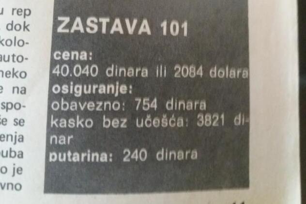 Prema informacijama iz magazina, model Zastava 101 je koštao 40.040 dinara, odnosno 2.084 dolara. Otkako se automobil pojavio na tržištu prošlo je pet decenija, a računajući inflaciju, danas bi koštao 11.441 euro.